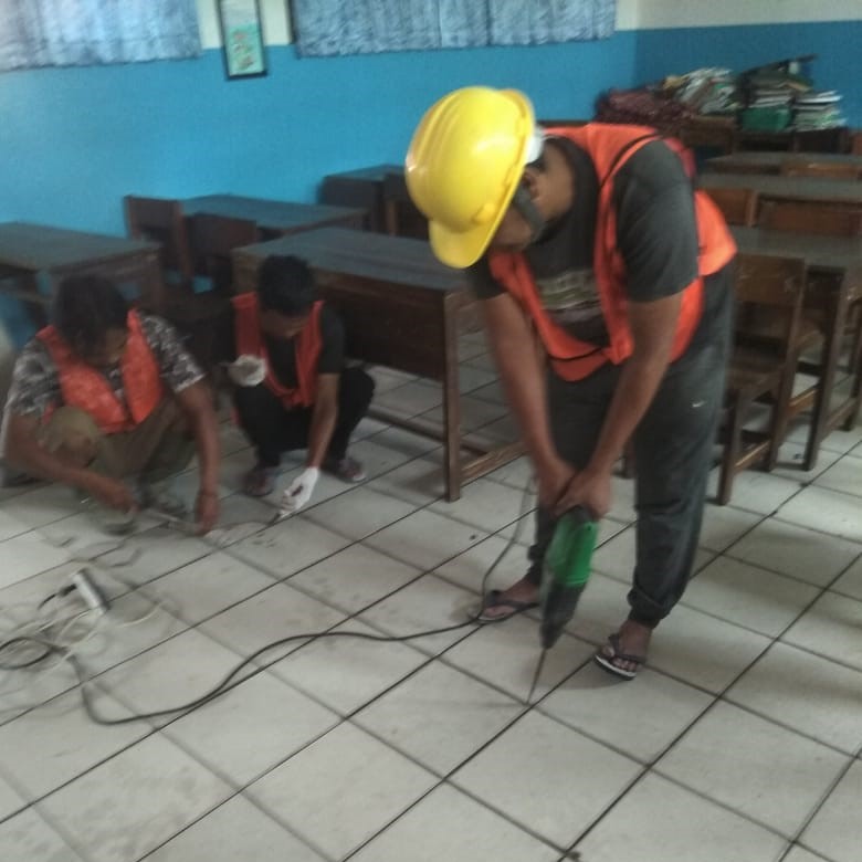 Pekerjaan dilakukan secara bertahap dan terkoordinasi dengan memperhatikan standar mutu, keselamatan kerja (K3), serta kondisi operasional sekolah agar aktivitas belajar mengajar tetap dapat berjalan dengan baik.